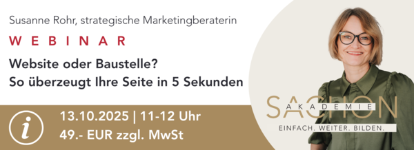 Der erste Eindruck entscheidet – auch im Netz. Besucher:innen entscheiden in wenigen Sekunden, ob sie auf Ihrer Website bleiben oder abspringen. In diesem kompakten Webinar erfahren Sie, wie Sie Ihre Website gezielt so gestalten, dass Ihre Kunden sofort erkennen, wer Sie sind, was Sie anbieten – und warum sie bei Ihnen genau richtig sind. Mit vielen Praxisbeispielen speziell für KMUs und Handwerksbetriebe.